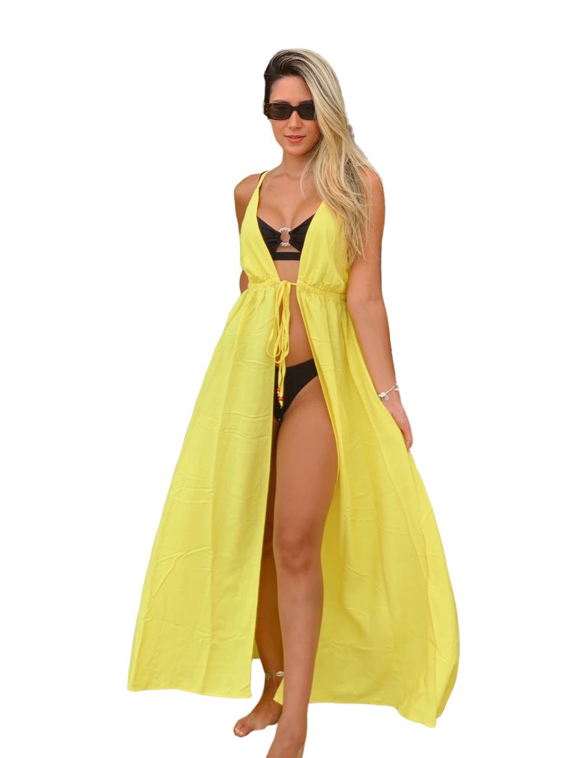 Dica: Versatilidade é o sobrenome dessa saída. Na cor amarelo sol que é a definição do verão e que combina com biquínis de diferentes estilos e cores. Use como saída de praia com seu biquíni favorito, use como vestido pois tem a opção de regular na cintura ou use ela semi-aberta com um shortinho para curtir um dia ensolarado. Como não se apaixonar por peças que compõem o look para o dia-a-dia, até um look noturno para aquele jantar romântico na praia.